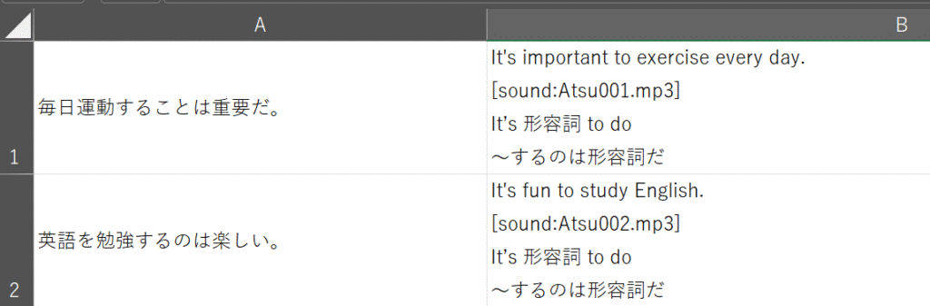 最後に音声ファイルをAnkiアプリに登録するため、CSVファイルを加工しました。こんな感じ↓