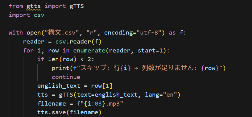 これを使わない手はないので、CSVに記載されている英文から音声ファイルを作成しようと思いました。