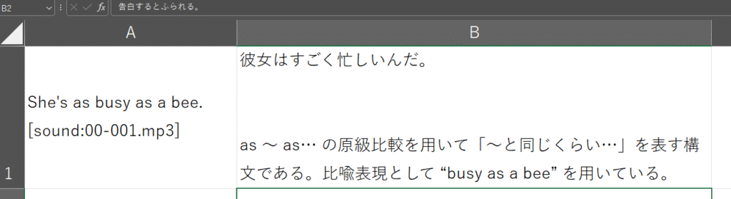 このCSVファイルをAnkiに登録することで、英語の音声を聞きながら文法を学べる暗記カードが完成しました。